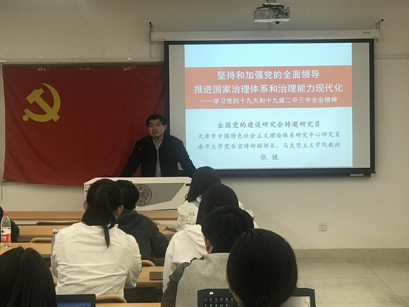 4月17日晚,学院党校积极分子培训请到全国党的建设研究会特邀研究员、天津市中国特色社会主义理论体系研究中心研究员、南开大学党委宣传部副部长、马克思主义学院教授张健为学员主讲了一堂学习党的十九大和十九届二中、三中全会精神的主题党课。