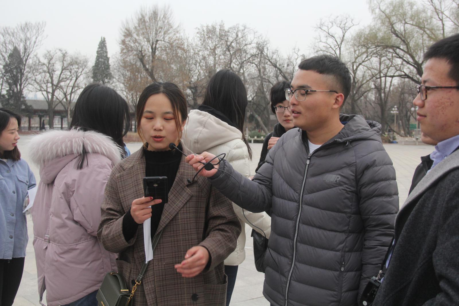 接着,经过再一次抽签和任务安排,团员们针对中华人民共和国成立70周年、南开大学建校100周年和习近平总书记视察京津冀三个主题对路人进行了访谈。在访谈过程中,团员们听到了许多生动并具有启发性的回答。
