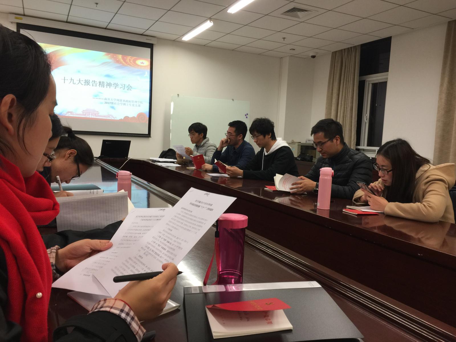 (通讯员:刘颖)为了更好的对十九大报告精神进行学习,南开大学周恩来政府管理学院2017级社会学博士生党支部于2017年11月10日18:00在学院324会议室召开了“十九大报告精神学习会”。十九大的胜利召开为我们点亮了未来前行方向的指路灯。在学习会上,党支部成员在支部书记郝光耀的主持下有序地进行了发言和讨论,加深了对于十九大报告精神的领会。