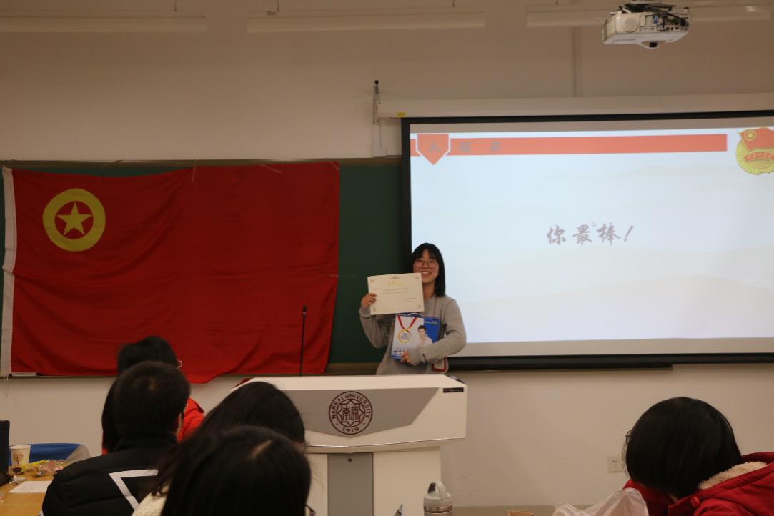 该部分为知识竞答环节,题目分为小组必答题和个人抢答题。五个团小组积极参与,踊跃发言,经过激烈的角逐,“吉吉王国”团小组及郜淼、刘雨喆、邱文辉三位同学胜出,分别被授予16级国政专业团支部“理论之组”和“理论之星”荣誉称号。在欢声笑语之中,同学们巩固了理论学习的内容,对十九大报告有了更深入的了解。