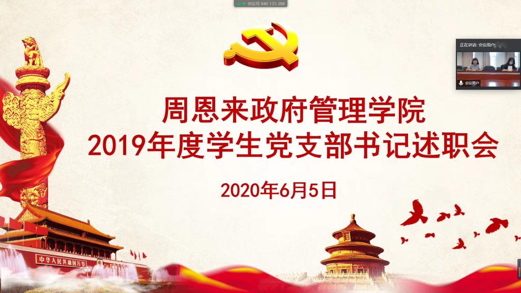 (通讯员:杨晓颖 岳庆磊)为进一步认真贯彻习近平新时代中国特色社会主义思想,落实各级党组织关于加强基层支部建设的工作要求和重点任务,推动全面从严治党向基层党支部纵深发展,2020年6月5日,周恩来政府管理学院党委组织召开2019年度学生党支部书记述职报告会。学院党委副书记兼副院长宋媛、学院团委书记杨晓颖、各年级辅导员和各学生党支部书记参加会议。