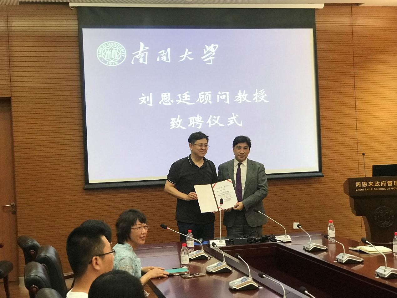 (通讯员:薛博文)南开台湾校友总会会长刘恩廷先生顾问教授致聘仪式于2019年6月10日下午在我院144会议室成功举行。校党委常委、副校长朱光磊,政府学院党委书记王慧,院长孙涛和各专业学生代表参加活动。活动由政府学院副院长程同顺教授主持。孙涛院长为刘恩廷先生颁发“南开大学周恩来政府管理学院顾问教授”聘书。
