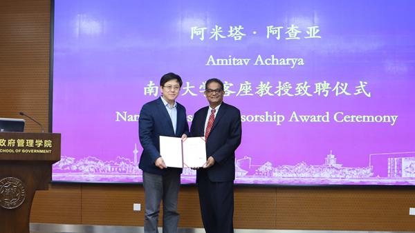 南开新闻网讯(通讯员 周雨晨) 4月15日,美利坚大学杰出教授、联合国教科文组织跨国挑战与治理讲座教授、国际研究协会前主席阿米塔·阿查亚做客“百年南开大讲坛”,以“全球秩序的危机与重建:21世纪初的思考”为题,在南开大学周恩来政府管理学院报告厅为师生们带来了一场精彩的学术报告。报告会前,周恩来政府管理学院负责人向阿米塔·阿查亚教授致送南开大学客座教授聘书。