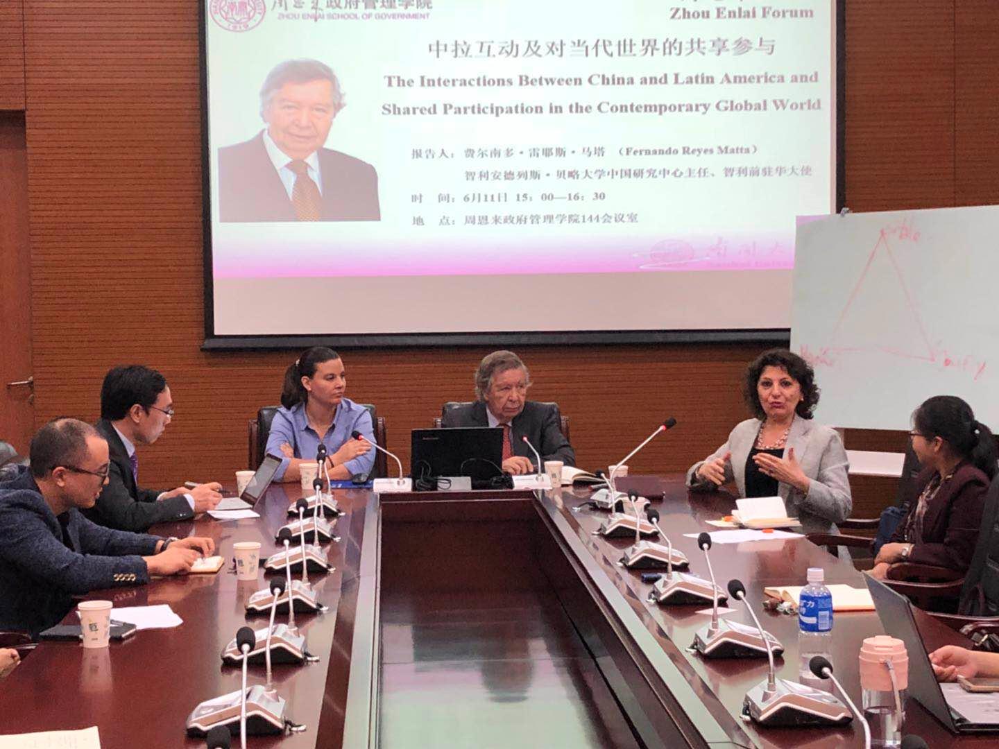 智利安德列斯·贝略大学中国研究中心主任、智利前驻华大使费尔南多·雷耶斯·马塔教授应邀于2018611日做客南开大学周恩来政府管理学院,上午1030与周恩来政府管理学院国际关系系的部分教师和拉美留学生进行了座谈。下午15时做客周恩来论坛,做了题为“中拉互动及对当代世界的共享参与”的学术讲座。讲座由我校周恩来政府管理学院副院长刘丰教授主持,周恩来政府管理学院的师生参加了本次讲座。