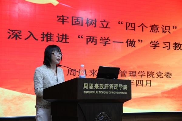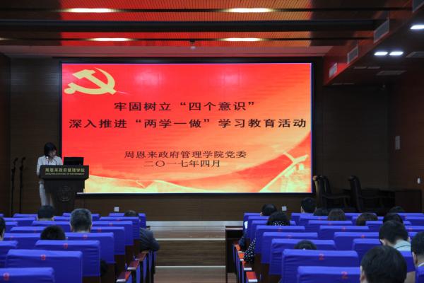 为迎接党的十九大召开,进一步深入学习贯彻党的十八届六中全会精神,4月20日下午,周恩来政府管理学院在学院大楼128会议室组织教师党员进行专题学习,学院党委书记王慧以牢固树立“四个意识”,深入推进“两学一做”学习教育活动为题目进行主题宣讲,学院全体党员干部和教师党员参加了本次主题宣讲学习。