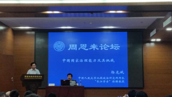 (通讯员 何李)6月30日下午2点30分,中国人民大学比较政治制度研究所所长杨光斌教授做客周恩来论坛,作了题为“中国的国家治理能力及其挑战”的学术报告。讲座由周恩来政府管理学院院长吴志成教授主持。参加讲座的有杨龙教授、郭道久副教授,“中国政府发展”暑期学校的学生及其他本校同学。