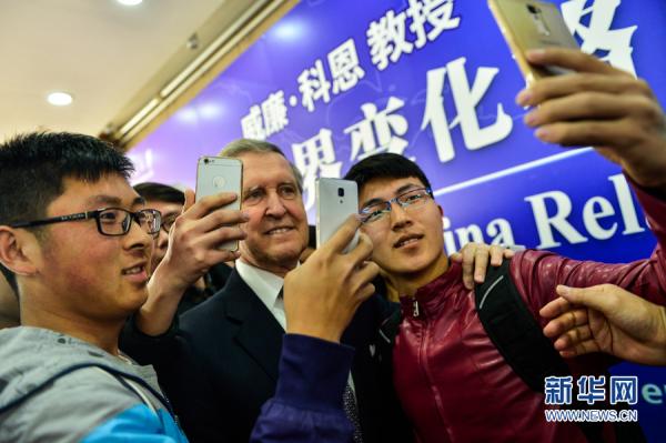 3月23日,美国前国防部长科恩在南开大学与大学生合影。新华网发(游思行摄)