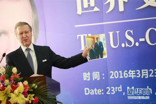 3月23日,美国前国防部长科恩在演讲中展示一张自己与姚明的合影。新华网发(总汇摄)