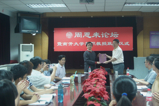 南开新闻网讯(通讯员 何睿)近日,中国亚非学会副会长刘鸿武教授做客“周恩来论坛”并受聘为南开大学周恩来政府管理学院兼职教授。副校长朱光磊出席并为刘鸿武致送聘书,周恩来政府管理学院院长吴志成主持论坛和致聘仪式。