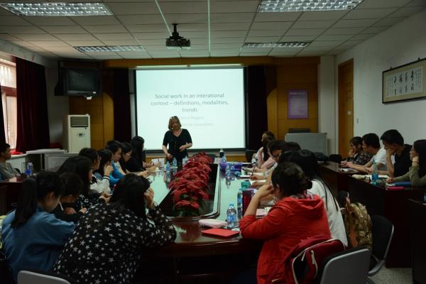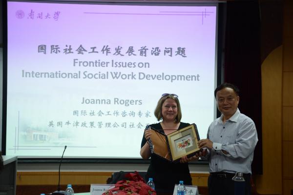 (通讯员 李璇、杜平 摄影 张馨方)5月13日,国际社会工作咨询专家、英国牛津政策管理公司社会工作专家Joanna Rogers女士,受社会工作与社会政策系邀请在范孙楼为南开师生带来了一场题为“国际社会工作发展前沿问题”的讲座。讲座由周恩来政府管理学院社会工作与社会政策系主任关信平教授主持,多位老师和来自社会工作、社会保障等不同专业的的硕博士研究生、本科生一同聆听了此次讲座。