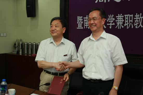 南开新闻网讯(记者 陆阳 摄影 任永华)6月11日,第十二届全国人大内务司法委员会副主任委员、中国社会科学院原副院长李慎明受聘南开大学兼职教授,并作为“周恩来论坛”嘉宾在办公楼为南开师生带来精彩的学术报告。校党委书记薛进文、副校长朱光磊出席致聘仪式,周恩来政府管理学院负责人以及师生代表参加。