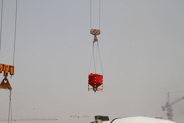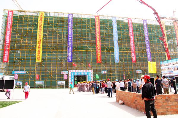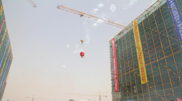 象征院楼封顶的最后一斗浇筑混凝土在轰隆的鞭炮声中吊上楼顶