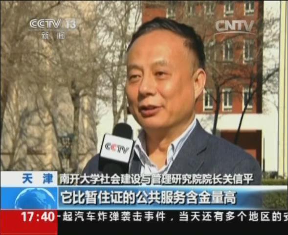 2014年4月18日,央视新闻频道对天津市将于6月1日取消“蓝印户口”政策的新闻进行了报道。央视记者采访南开大学周恩来政府管理学院关信平教授。节目于4月18日央视新闻频道《新闻直播间》栏目播出。