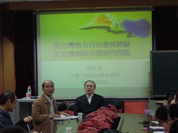 10月16日-28日台湾大学前副校长、台湾大学社会科学学院前院长赵永茂教授应邀来我院讲学,作了“县市合并与区域治理的创新研究”、“地方民主与地方治理的发展趋势与研究方法”以及“从台湾地方自治发展经验反思几个政治发展的问题”三场学术讲座。