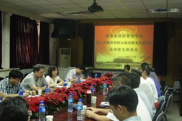7月18日,周恩来政府管理学院召开深入开展党的群众路线教育实践活动征询意见座谈会,广泛征求党员干部和群众意见。学院党委书记王慧、院长吴志成、系主任、教师支部书记、民主党派代表、教师代表、管理干部代表和学生代表参加。