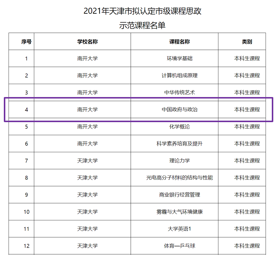 日前,2021年天津市课程思政示范课程评审结果公示。经学校申报、专家评审,最终认定“中国政府与政治”等110门普通本科课程为市级课程思政示范课程。