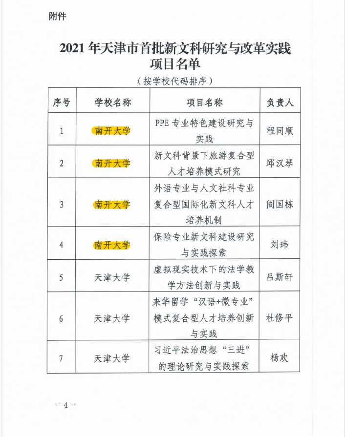 目前,天津市首批新文科研究与改革实践项目已经公示,市教委认定南开大学“PPE专业特色建设研究与实践”等59个项目为天津市首批新文科研究与改革实践项目。