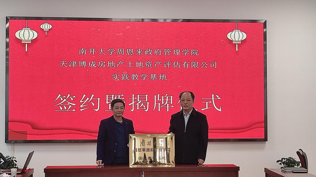 (通讯员:段煜坤 王修彦 王燕)为进一步发挥校友企业资源优势,提升学生专业实践能力,深化访企拓岗工作,3月3日,南开大学周恩来政府管理学院与天津博成房地产土地资产评估有限公司共同建立的“南开大学周恩来政府管理学院实践教学基地”在博成咨询公司揭牌成立。博成咨询公司董事长宋红剑、总经理高藕叶、周恩来政府管理学院副院长程同顺、团委书记王修彦出席仪式并为基地揭牌。