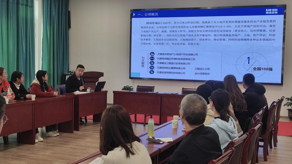政府学院副院长程同顺教授对学院的发展历史、基本情况、学科设置与建设,从专业与产业角度分析周恩来政府管理学院与天津博成房地产土地资产评估有限公司的契合之处,鼓励学生更好地用所学知识为社会发展服务。