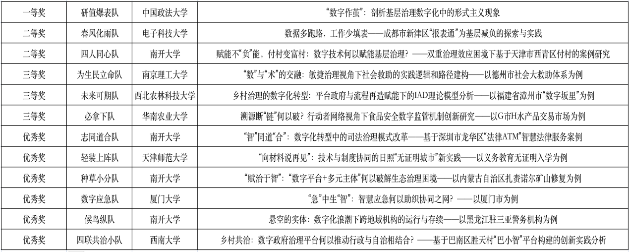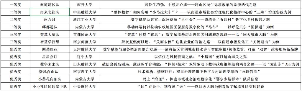 南开大学“志同道合队”、天津师范大学“轻装上阵妒队”、南开大学“种草小分队”、厦门大学“数字应急队”、西南大学“四联共治小队”获得本次案例大赛本科生赛道优秀奖。天津财经大学“四朵红花队”、辽宁大学“星星点灯队”、山东财经大学“微风自由队”、内蒙古大学“小葵花向阳队”、中央财经大学“小小社区通通拿下队”获得本次案例大赛研究生赛道优秀奖。
