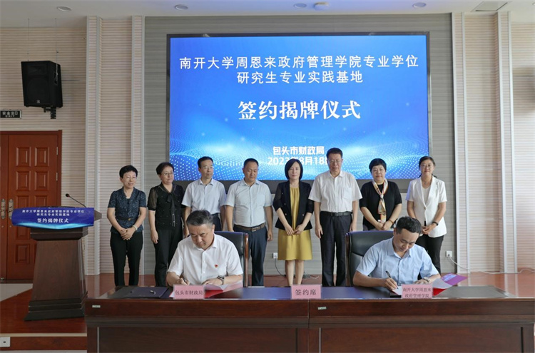 学院与内蒙古包头市财政局签约“南开大学周恩来政府管理学院专业学位研究生专业实践基地”,双方加强对财政实践领域前沿问题的研究,搭建起财政研究与人才培养的战略平台,同时为包头市财政局提供政策咨询。