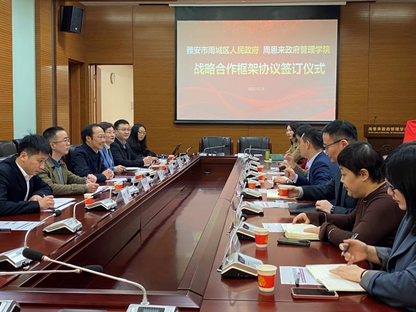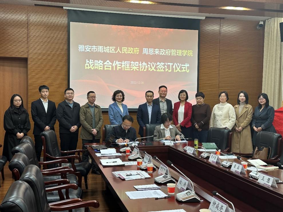 为切实发挥我院人才学科优势,持续深化校地交流共建,2023年12月6日,南开大学周恩来政府管理学院与四川省雅安市雨城区人民政府在津隆重举行战略合作框架协议签约仪式。中共雅安市雨城区委常委、组织部部长白涛,区委党校常务副校长方春风,区人力资源和社会保障局副局长钟成亮,区委组织部党员教育中心主任罗照民及区有关部门负责同志;南开大学周恩来政府管理学院党委书记王慧,副院长吴晓林,MPA中心主任翟磊,MPA中心副主任张志红,行政管理系主任蔡声霞,行政管理系锁利铭、丁凡琳、杨文婷老师以及周恩来政府管理学院40余名师生出席仪式。