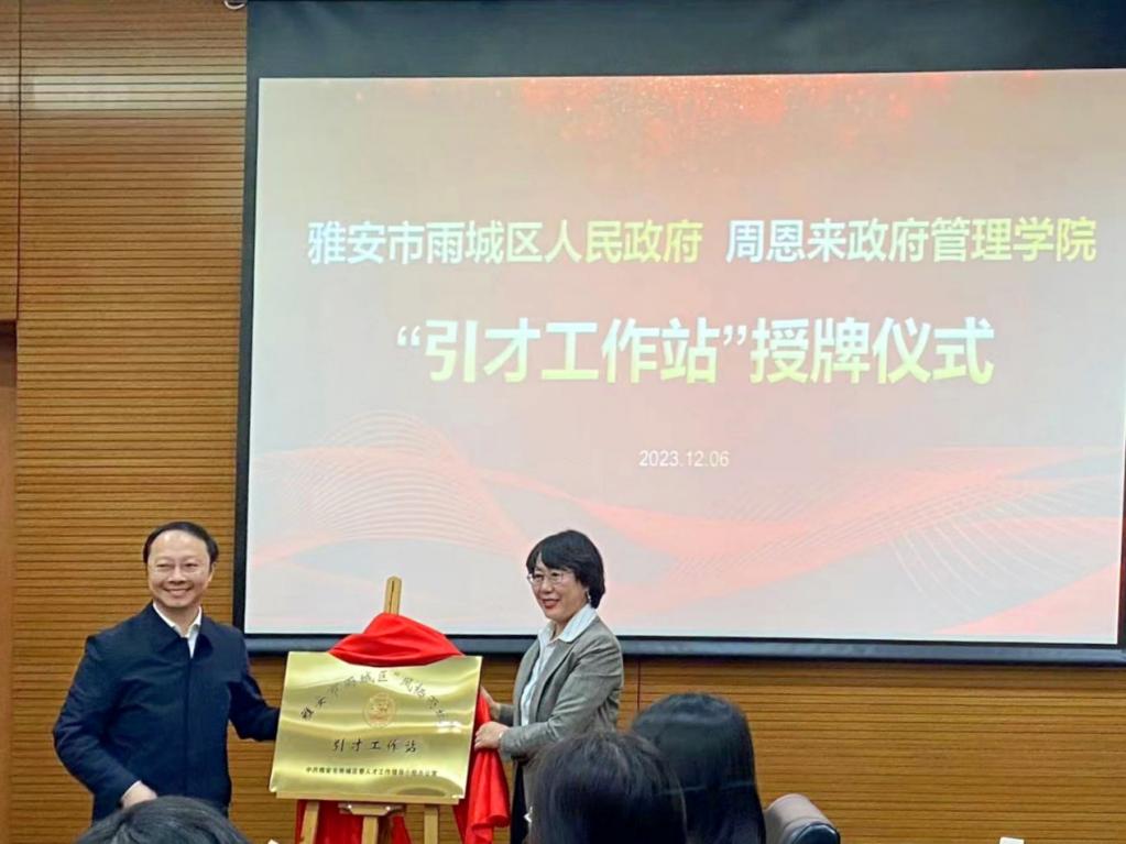 签约仪式结束后,白涛部长代表雅安市雨城区人民政府向周恩来政府管理学院授予“风栖雨城”引才工作站。白涛部长表示,希望双方进一步拓宽长效深度合作机制,强化合作能力建设,加强人才资源共享,鼓励同学们到雨城区创业就业。