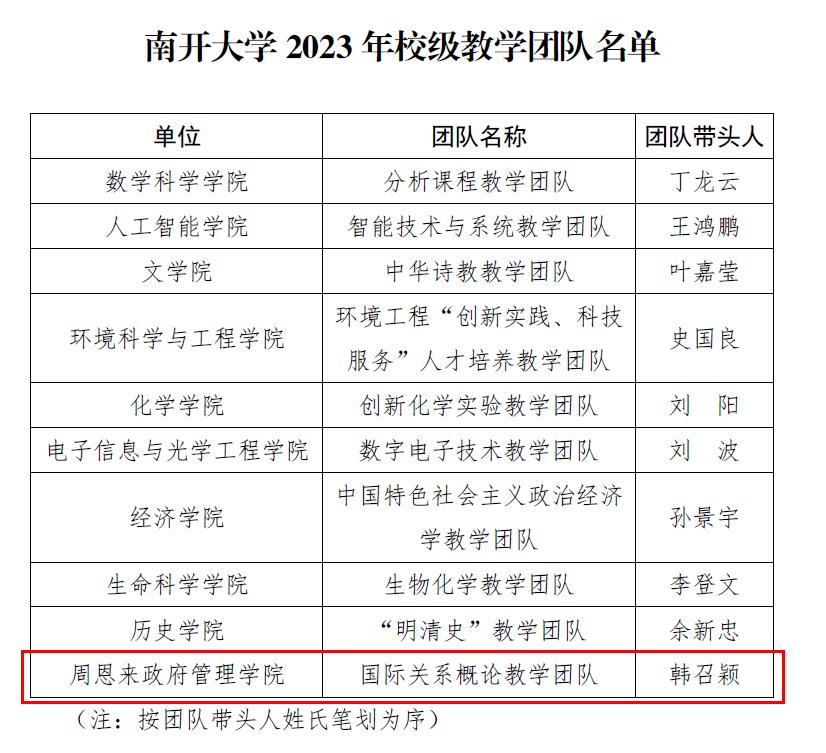 日前,南开大学公布了2023年校级教学团队和校级教学名师奖评审结果,共有十个教学团队获南开大学校级教团队称号,十位教师获评校级教学名师奖。其中,我院国际关系系韩召颖教授作为带头人的国际关系概论教学团队获评南开大学校级教学团队称号。