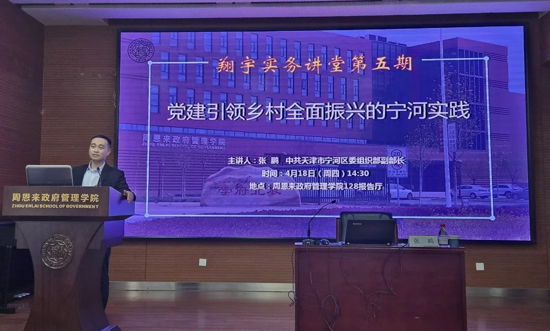 (通讯员:王燕 杨永远)2024年4月19日,南开大学周恩来政府管理学院“翔宇”实务讲堂暨中国经验进校园讲座第5期开讲。中共天津市宁河区委组织部副部长张鹏同志受邀在南开大学做题为“党建引领乡村全面振兴的宁河实践”的讲座。政府学院党委书记王慧,副院长、中国政府发展联合研究中心副主任吴晓林教授,学院团委书记王修彦出席研讨。会议由副院长吴晓林教授主持,学院200多名师生参加。
