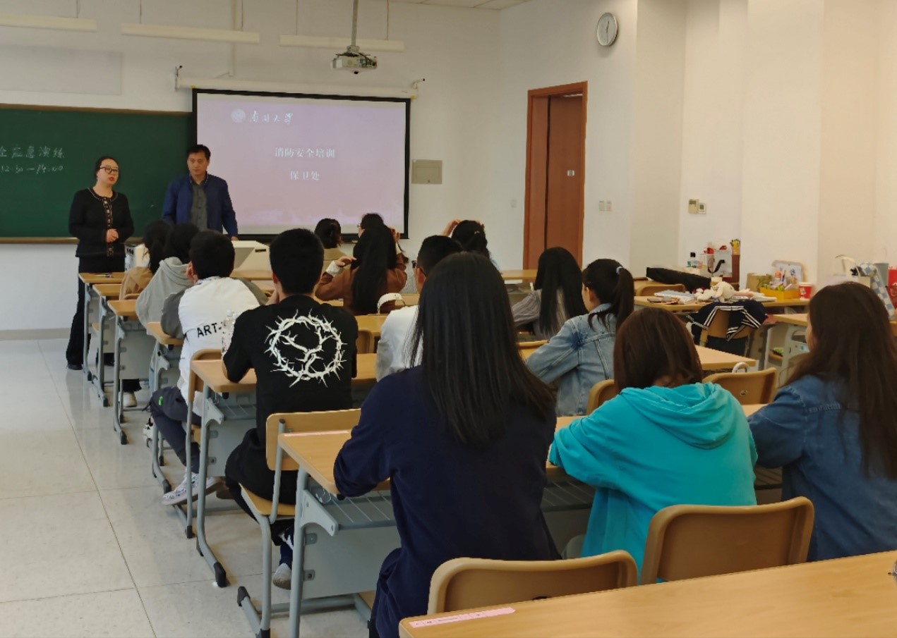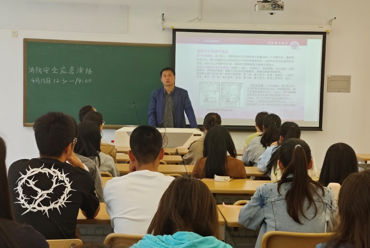演练开始前,保卫处张琪老师为大家培训消防安全知识,他结合重点案例,详细介绍了火灾的分类、灭火基本原理以及消防安全管理工作等相关内容。培训过程中,参加培训的师生认真听讲,并借助现场的消防器材展开了深入交流。