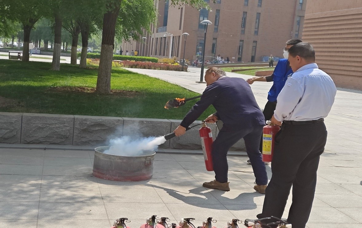 培训结束后,消防警报响起,院内师生按照演练预案,快速有序地从安全通道和安全出口撤离,并在户外场地集合。张琪老师向大家介绍各种灭火器的使用方法和注意事项。工作人员引燃燃烧物,在场师生结合消防知识,利用灭火器有序灭火。