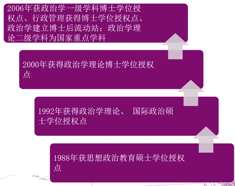 1988年获得思想政治教育硕士学位点,1992年获得政治学理论硕士学位点,后来又获得了国际政治硕士学位点,2000年获得了政治学理论博士学位点,2006年获得了政治学一级学科博士学位点;同年,行政管理也获得了博士学位授权点,政治学获准建立博士后流动站。随后,政治学理论二级学科成为国家重点学科。也就是说,从获得博士点到成为重点学科,我们只用了7年的时间!2022年又自设了国家安全学学位点。2004、2008、2012年三轮学科评估,政治学都名列全国第五,2016年获得A-等级。第五轮政治学又取得了新的进步;公共管理一级学科进入全国第一梯队,2020年公共管理专业学位获评A等级。此外,一批优秀的研究中心在智库建设等方面也取得了相当不错的成绩。
