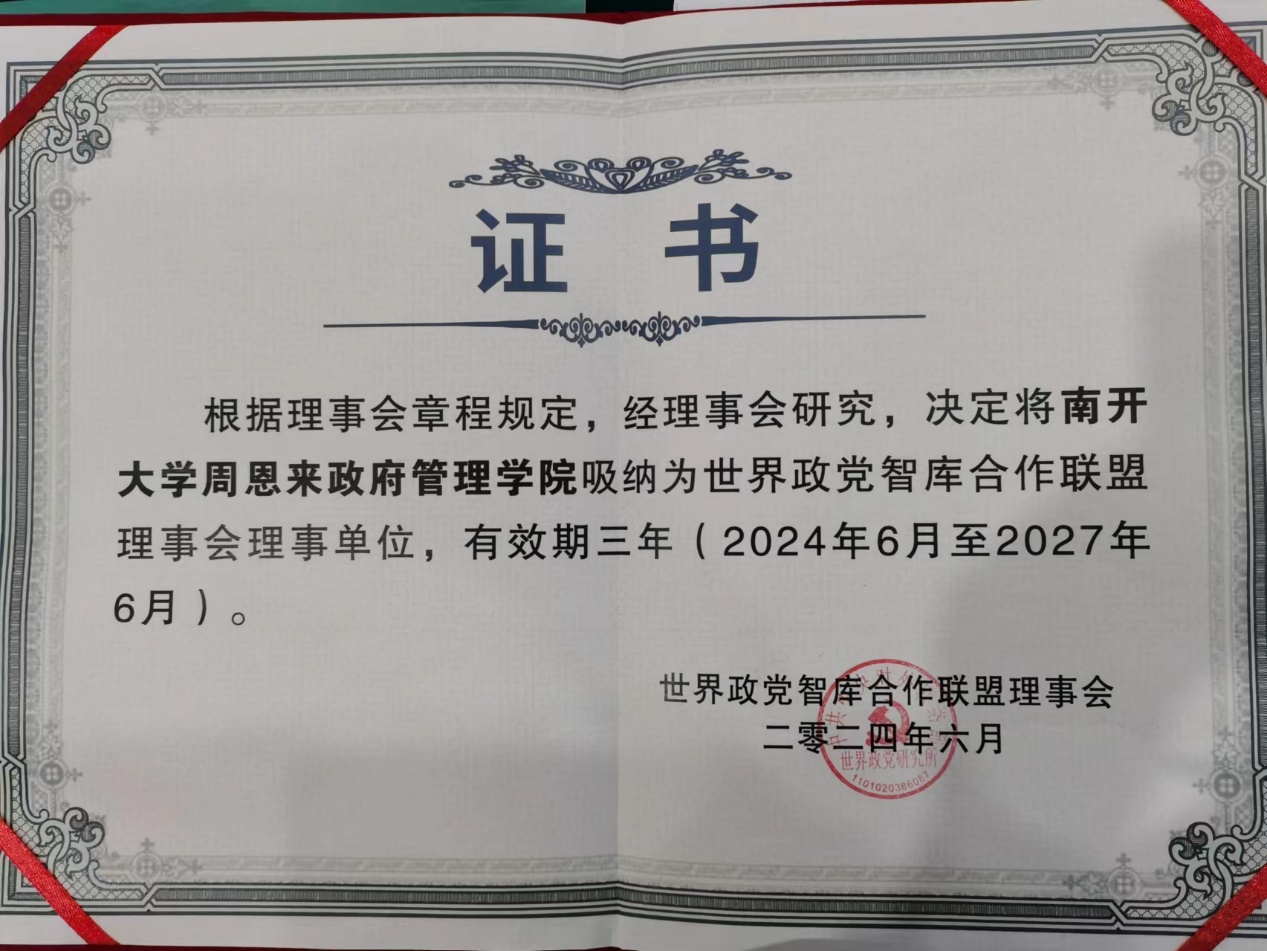 2024年6月5日,由中共中央对外联络部发起的“世界政党智库合作联盟”第一届理事会在北京召开。南开大学周恩来政府管理学院被吸纳为世界政党智库合作联盟理事会理事单位。中共中央对外联络部副部长陈洲担任理事会理事长。中共中央对外联络部研究室主任、世界政党研究所所长金鑫在会上介绍了世界政党智库合作联盟的有关情况。