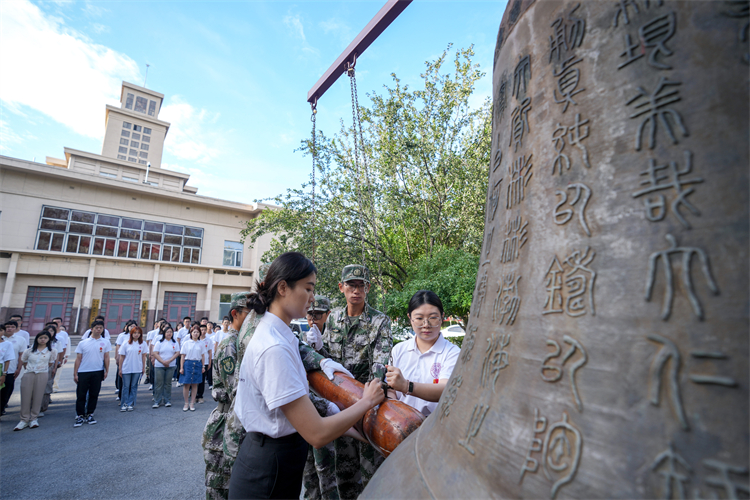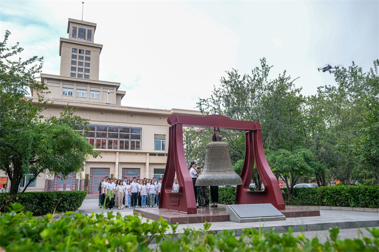 不忘曾经烽烟起,心中长鸣警钟声。同学们列队整齐,神情肃穆。6名学生代表神情凝重地推动钟槌,撞响南开大学校钟。“咚,咚,咚……”14响钟声有力地回荡在空中,寓意中国人民长达14年艰苦卓绝的抗战岁月,致敬中华民族不屈的脊梁。