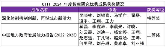 中心研究成果“深化体制机制创新,再塑城市新活力”获评CTTI 2024年度智库研究优秀成果特等奖,“中国地方政府发展能力报告(2022-2023)”获评CTTI 2024年度智库研究优秀成果二等奖。