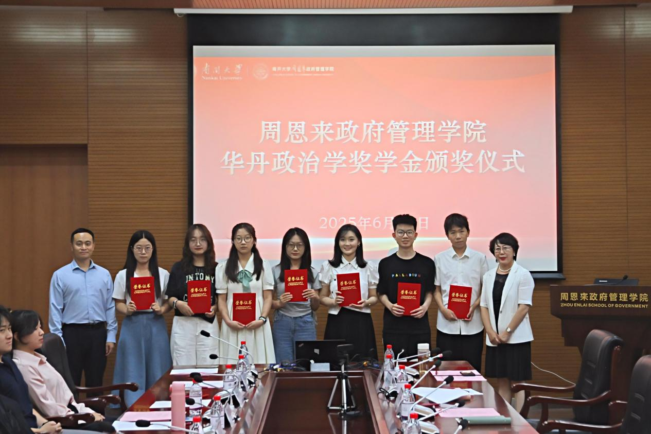 6月11日下午,“南开华丹政治学奖学金”颁奖仪式在周恩来政府管理学院144会议室举行。学院党委书记王慧,院长吴晓林,副院长刘婷,党委副书记兼副院长崔宇,获奖同学以及其他师生代表共同参加了本次活动。