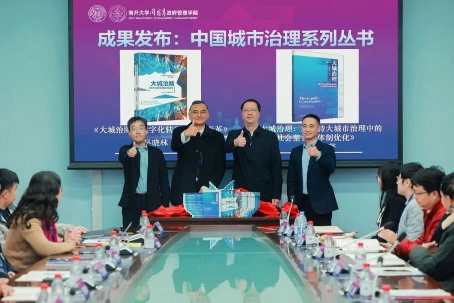 随后,开幕式举行了中国城市治理系列丛书发布仪式,南开大学党委副书记梁琪教授、香港城市大学人文社会科学院副院长王小虎教授、南开大学周恩来政府管理学院院长吴晓林教授、南开大学周恩来政府管理学院赵聚军教授共同为《大城治险:数字化转型与组织变革》和《大城治理:超大特大城市治理中的社会整合与体制优化》两部著作揭幕并合影留念。该系列丛书由南开大学周恩来政府管理学院院长吴晓林教授担任主编,汇集了近年来在城市治理领域的重要研究成果,标志着周恩来政府管理学院在中国城市治理自主知识体系建设上取得重要进展,为学界与实务界提供了宝贵的理论参考和实践指南。