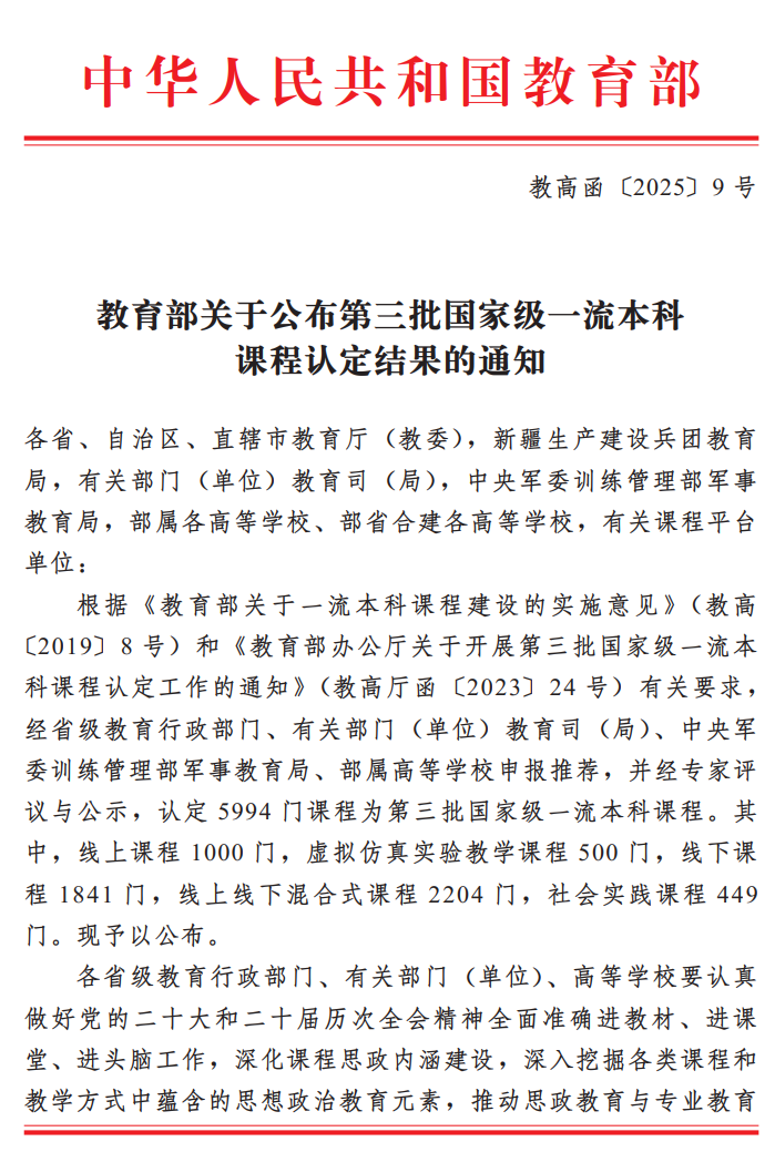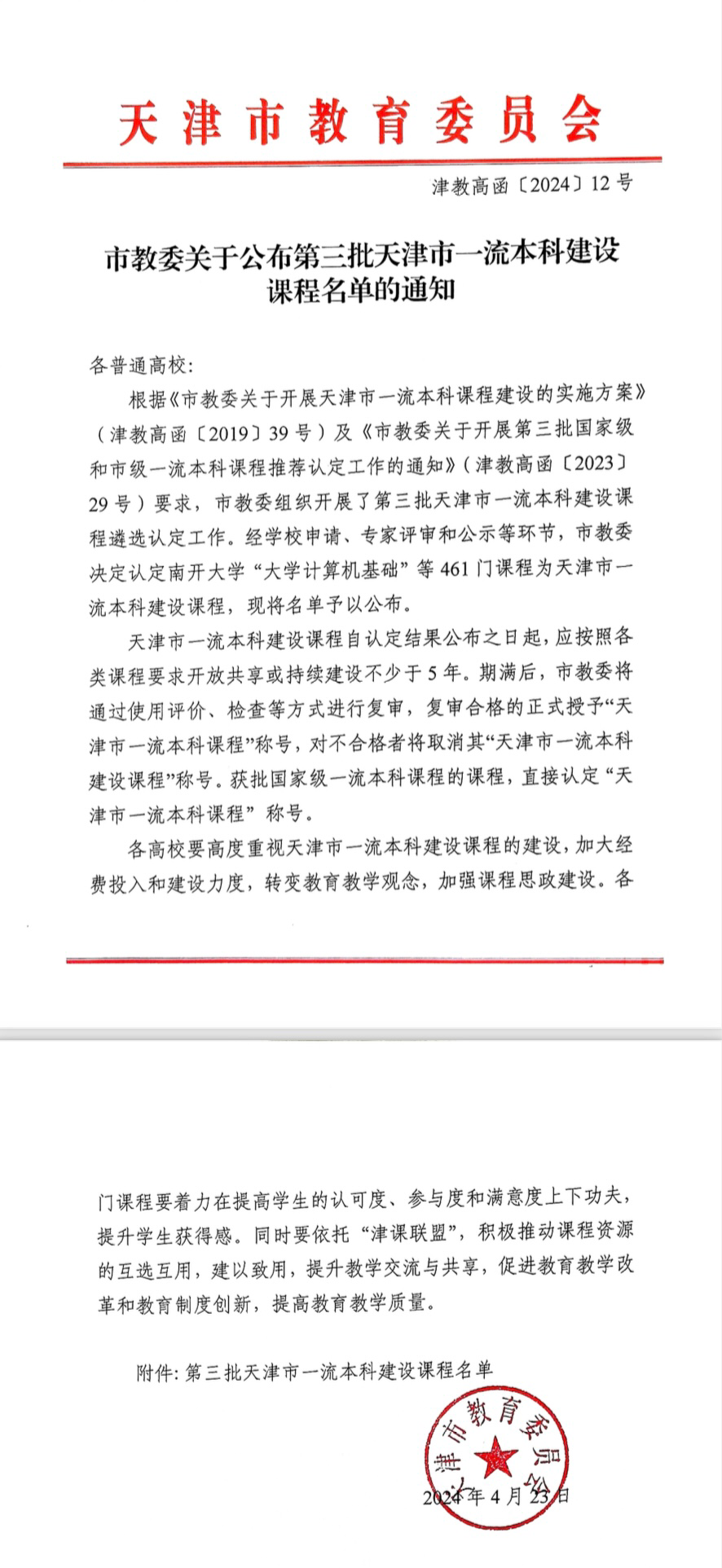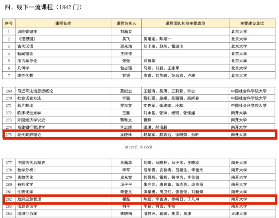 日前,教育部发布了《教育部关于公布第三批国家级一流本科课程认定结果的通知》(教高函〔2025〕9号)。南开大学周恩来政府管理学院共有2门课程入选“国家级一流本科课程”,分别为吴晓林教授负责的《现代政府理论》、翟磊教授负责的《政府应急管理》。