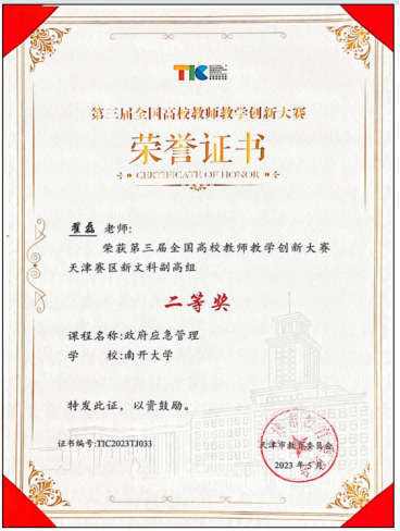 该课程于2019年获评天津市一流本科建设课程,2021年获评南开大学课程思政优秀典型,2023、2025年两次获全国高校教师教学创新大赛天津市赛二等奖,于2023年出版了配套教材《政府应急管理》。随着AI技术的发展,2025年课程组启动了知识图谱在线课程建设,目前已上线运行。课程的持续改革创新为相关教学提供了良好范例。