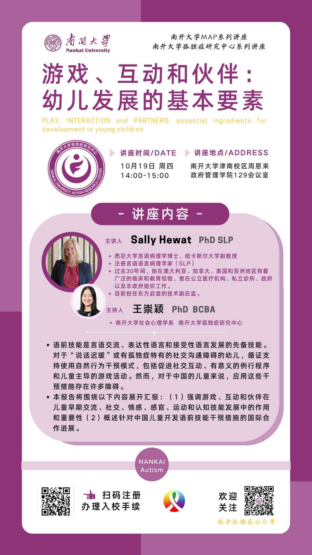 主持人: 王崇颖 南开大学周恩来政府管理学院 南开大学孤独症研究中心