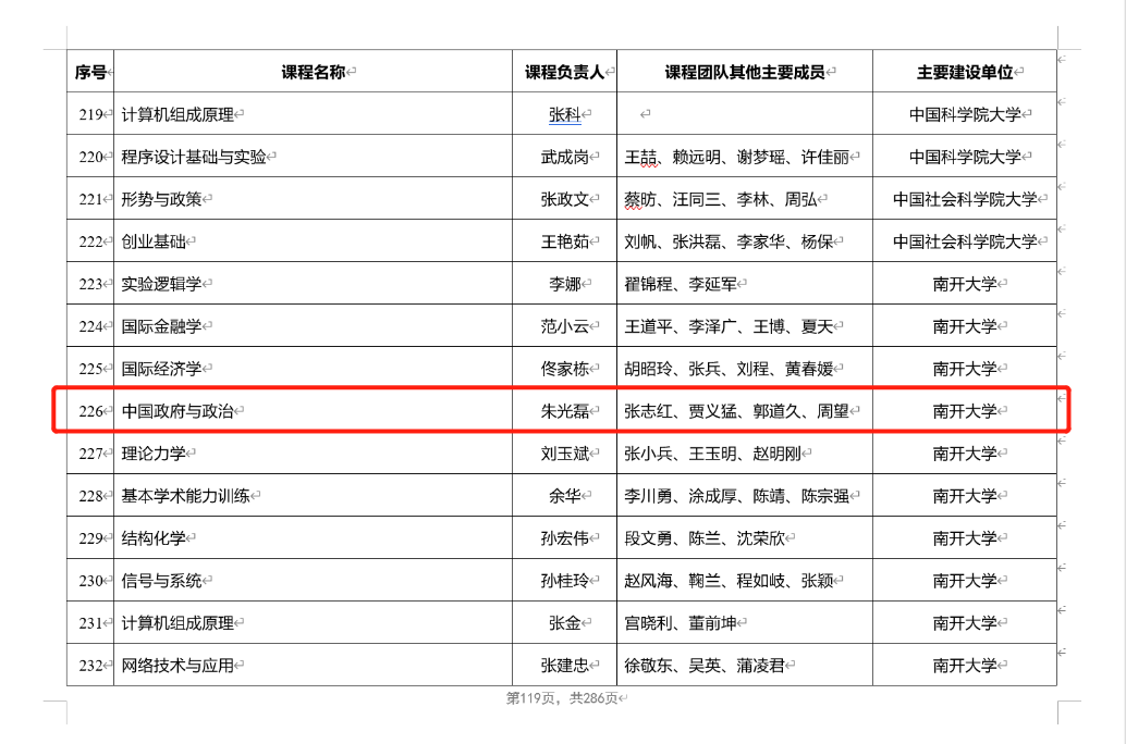 由首批“国家级教学名师”、南开大学周恩来政府管理学院讲席教授、中国政府发展联合研究中心主任朱光磊教授担纲课程负责人的 “中国政府与政治”本科课程作为唯一一门“中国政治”类课程成功入选。